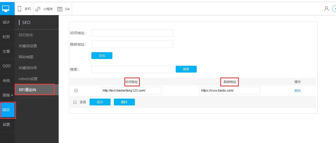 301重定向功能是由原来的域名跳转到新域名的,所以在使用这个功能的时候“访问网址和跳转网址”必须是分别不同的两个网址。且域名必须是备案的解析国内服务器上的。